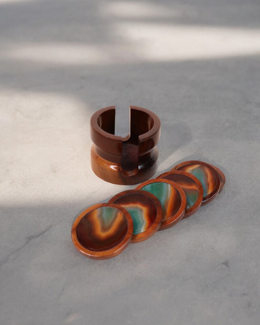 Wood and Brazilian Agate Stone Vintage Drink Coasters, Set of 6