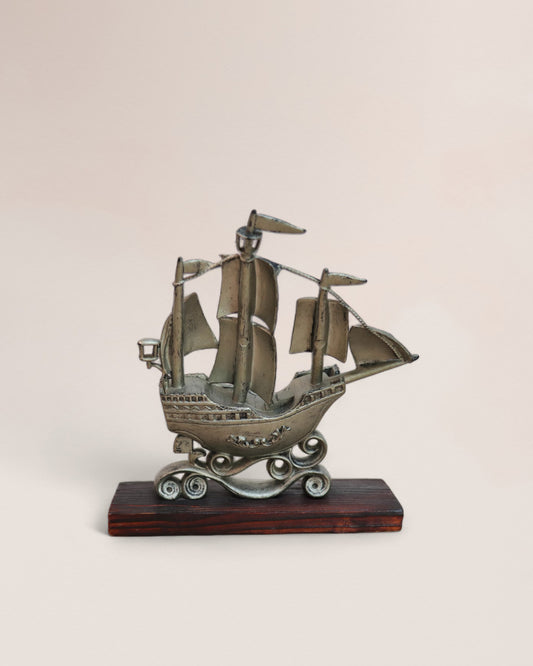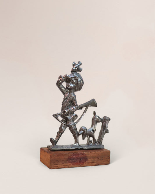 Vintage Pewter Figurine of Boy with Dog on Wood Stand