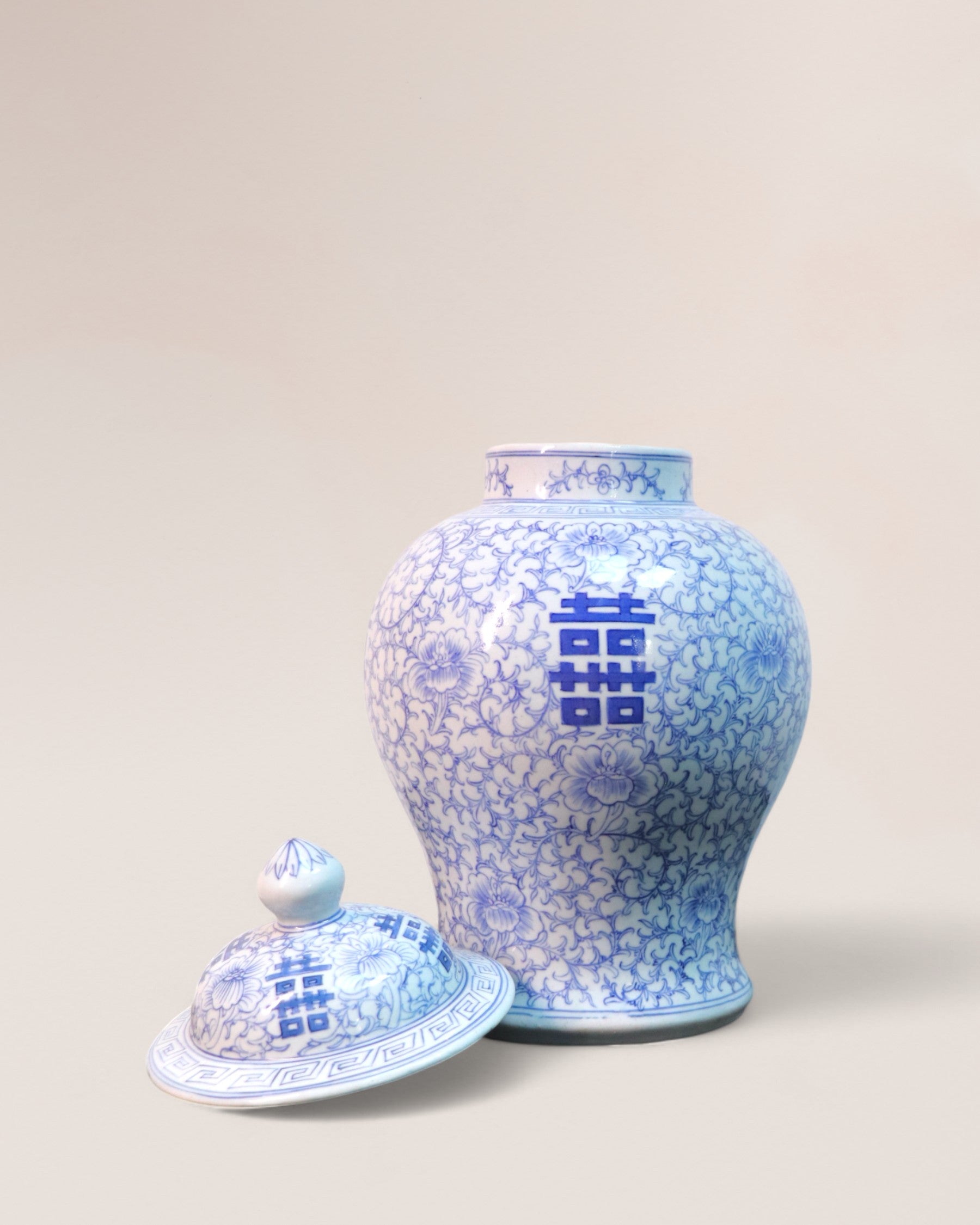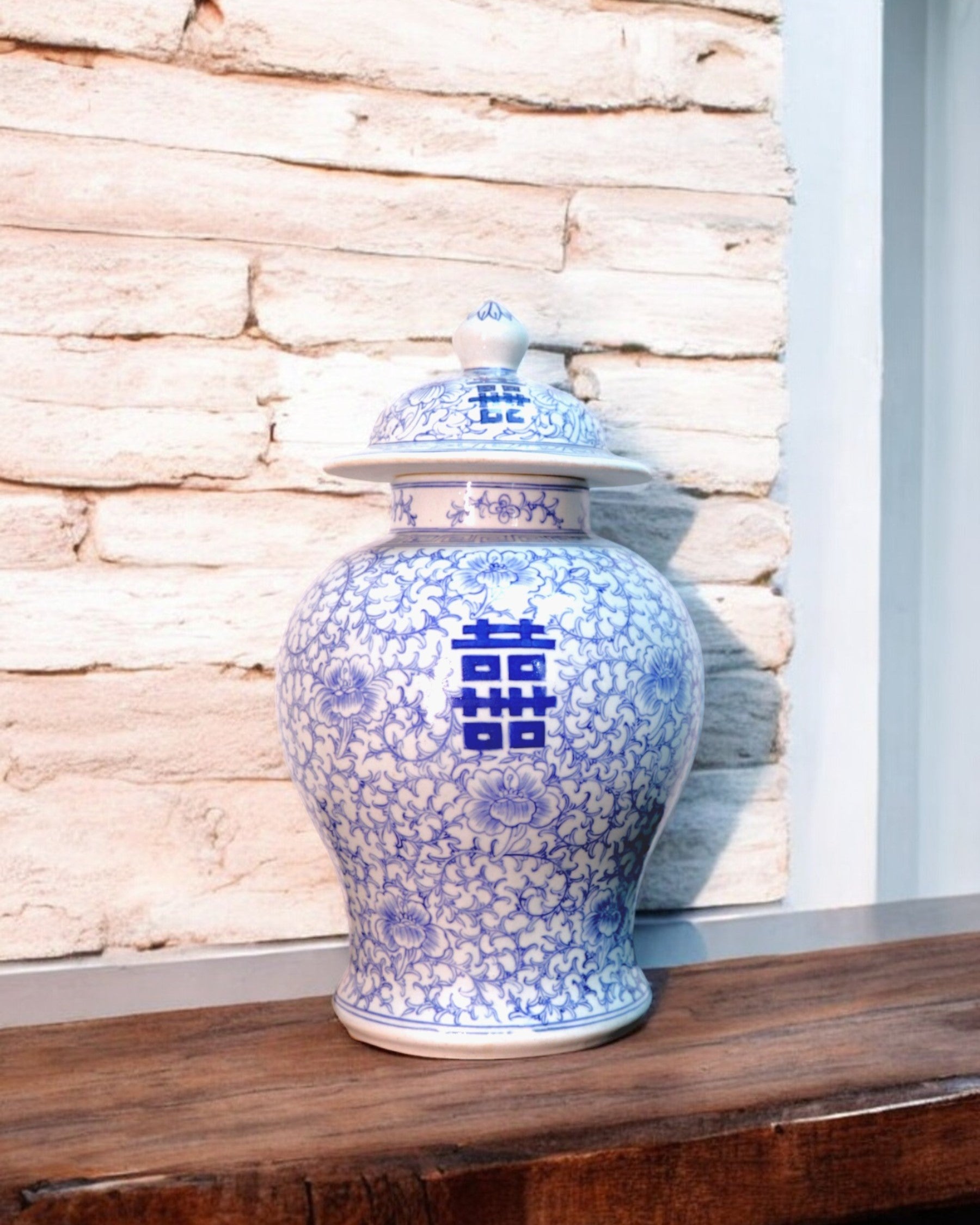 The vase features a classic baluster form, topped with a perfectly fitted lid, adding to its balanced and graceful aesthetic. The hand-painted designs are intricate and detailed, with the central "shuangxi" symbol surrounded by scrolling florals and decorative borders, making it a stunning piece of both visual and cultural significance.